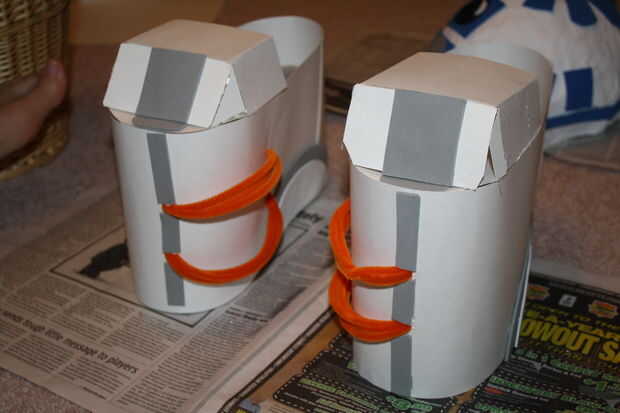 Por último, os adjunto las tiras de cartulina a mis zapatos usando un doble cinta adhesiva echada a un lado.  Luego los decoré (como se ve en la foto).  Esto era verdaderamente libre y no sigue ningún patrón de R2D2, excepto los limpiapipas naranja que se supone que se asemejan a los cables.