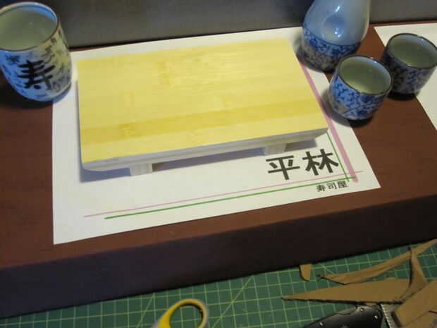 Para sushi, encontré algunas gomas de borrar con forma de sushi. Los pegué abajo en los bloques de madera, en caso de que algún maniquí borracho intentado comerlas. Una chica casi lo hizo...