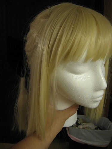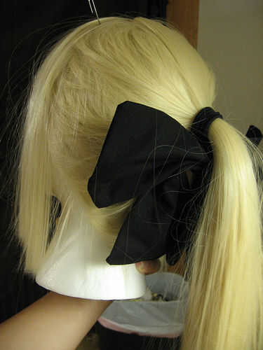 La peluca tengo no era destinada a poner en una cola de caballo para que no se ve bien. Probablemente voy a conseguir otra peluca que es corto con un clip en cola de caballo en su lugar. Para esta peluca, era originalmente más largo. Corte más corto y corte el flequillo a ambos lados de la cara. Hizo un arco con tela negra y un lazo del pelo que se le atribuye, luego poner la peluca.