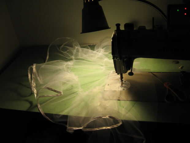 1. en vez de crinolina, usé tul, que no debilite por lo que es fácil trabajar con. I cortar paneles de largo 6 pulgadas y cosidos juntos para obtener un 6 pulgadas por yarda 8 tira, una 6 pulgadas por la tira de 4 yardas y un 6 pulgadas por yarda 2 tira.