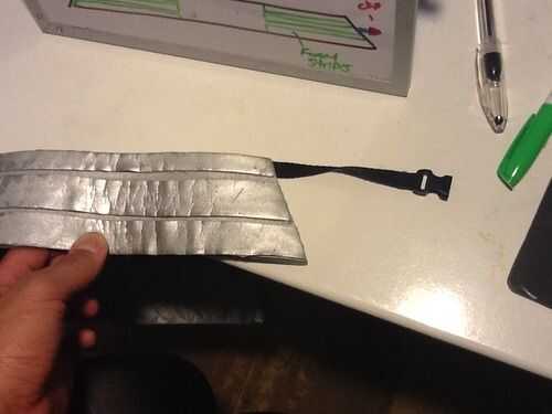 Una vez que se mide, toma una pistola de calentamiento y calentar la espuma por lo que conserva su forma alrededor de su cintura. Tomar tu espuma de artesanía y talla 3 tiras que Irán a cada lado (total 6 tiras). no necesitan conectarse en la parte de atrás, porque usted estará usando una capa (pic C). pintura plata