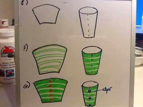 Tomar su espuma amarilla y envuélvalo alrededor de su muñeca. probablemente tendrá una curva forma en la parte superior (foto E). Una vez que es del tamaño adecuado, cortar 5 tiras de espuma amarilla y el pegamento sobre la espuma del pic E. Recuerde dejar algo de espacio entre las tiras para da algunos surcos (foto F).