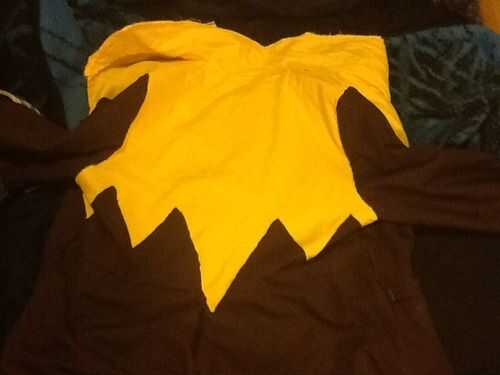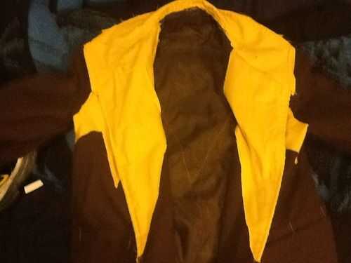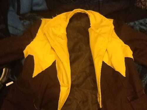 Una vez hecho esto, puse mi chaqueta en el suelo con la tela amarilla en la parte superior. Con cuidado corte la forma de la porción amarilla y había cosido en su lugar.
