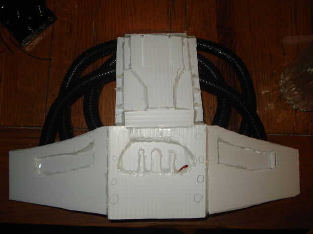 Pegué el tubo en el pecho con una cantidad generosa de pegamento caliente para la fuerza agregada. El tubo del medio fue el tiempo suficiente para mí utilizar únicamente una sección en el pecho entero, pero más tarde causó problemas con el montaje de la electrónica en el centro del pecho.