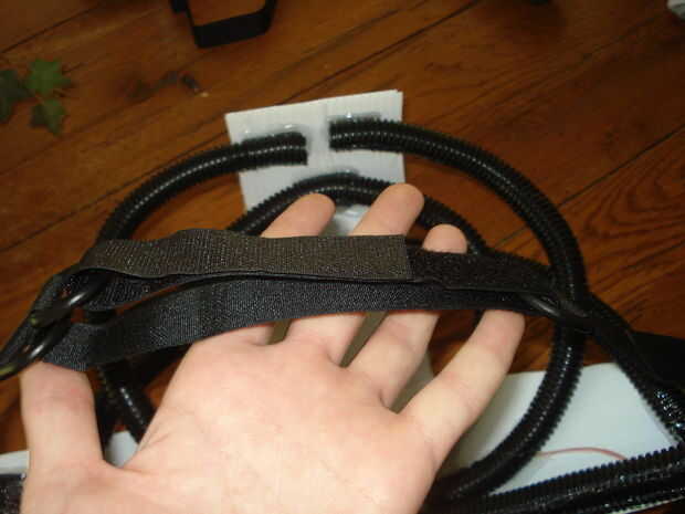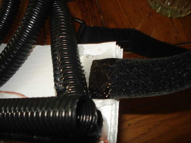 A continuación, corte la parte del gancho del velcro y pegamento en las correas, por lo que es la parte del lazo del velcro en el interior. Pegar ambos lados de la correa para el pecho ya que tendrá que soportar mucha presión. Hacer esto a ambos lados.