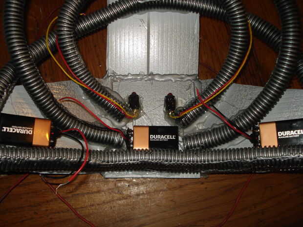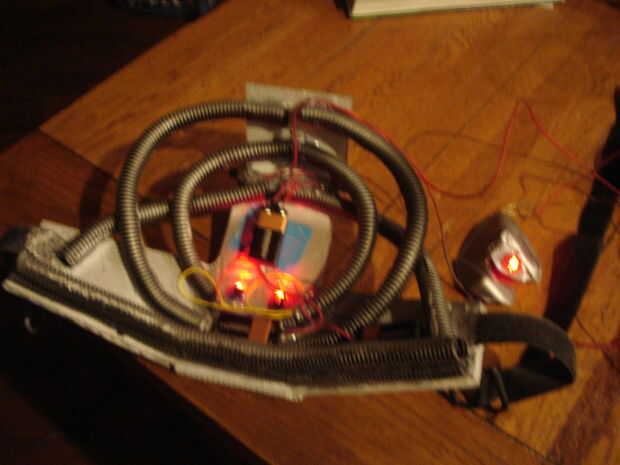 A continuación, alambré las luces en el pecho. Los LEDs están en paralelo, y las baterías también están en paralelo. El interruptor se encuentra en el lado para facilitar el acceso, y las baterías fueron atadas con cinta de doble cara espuma.