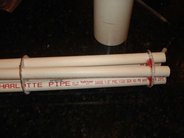 En primer lugar, comenzar con los barriles. Corte una sección de 10 pies de tubo de PVC de 1/2 en cinco secciones de 2 pies.