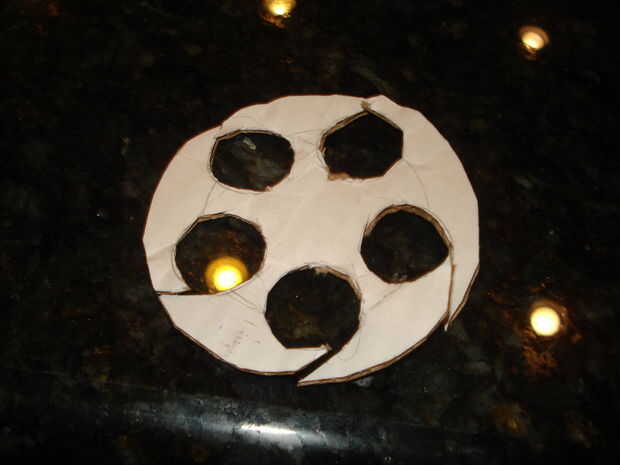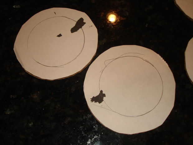 A continuación, trace el PVC en un círculo de cartón espaciados uniformemente alrededor de otro círculo dibujado, como en la segunda foto. Lo mismo para un disco de plástico corrugado y recorto tanto. Pegue el disco de coroplast 45mm desde el extremo de las barricas y el disco de cartón a medio camino entre ambos extremos.