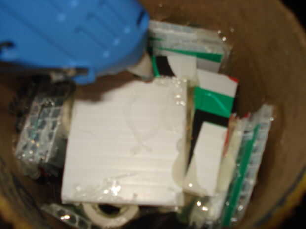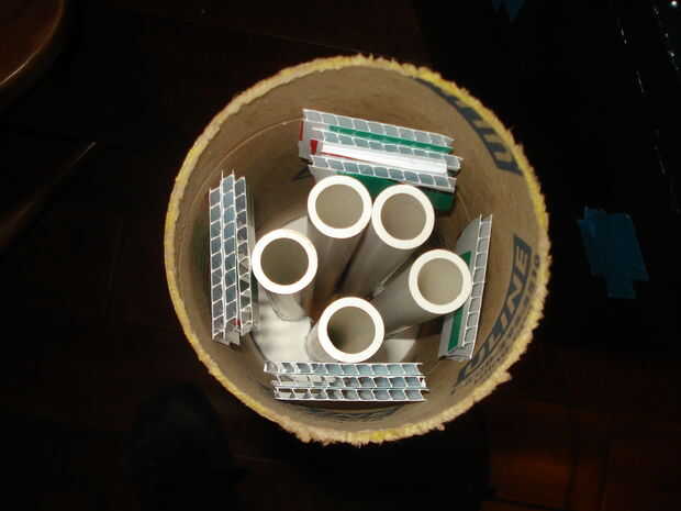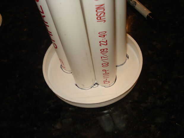 Ahora traza los barriles en un tapón para el tubo de un correo electrónico. Pegar la tapa de extremo 7 pulgadas hasta los barriles y pegamento a las 9 pulgadas tubo de envío. Utilice tiras de corrugado plástico como cuñas para colocar las barricas, y añadir un montón de pegamento caliente para apoyo.
