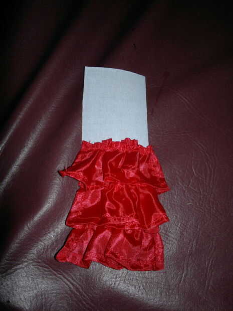 puede empezar por el paño del corte en forma rectangular como base. luego medir el ancho y corte otra tela con la longitud de 3 veces el ancho de la base. luego coserlas en un estilo ondulado en la base. luego coser una larga cinta en el otro lado.