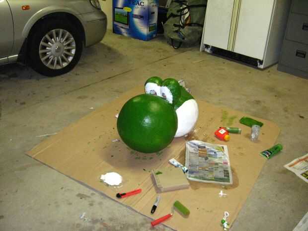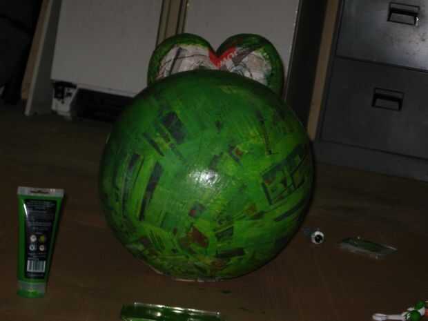 Pintar la nariz y la mitad de los ojos y la cabeza verde. El resto de la pintura blanca y pintura roja las espinas o envolver en cinta aislante roja (lo hice).