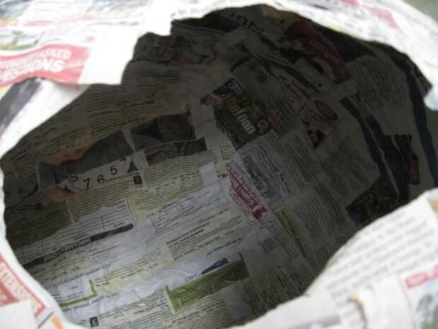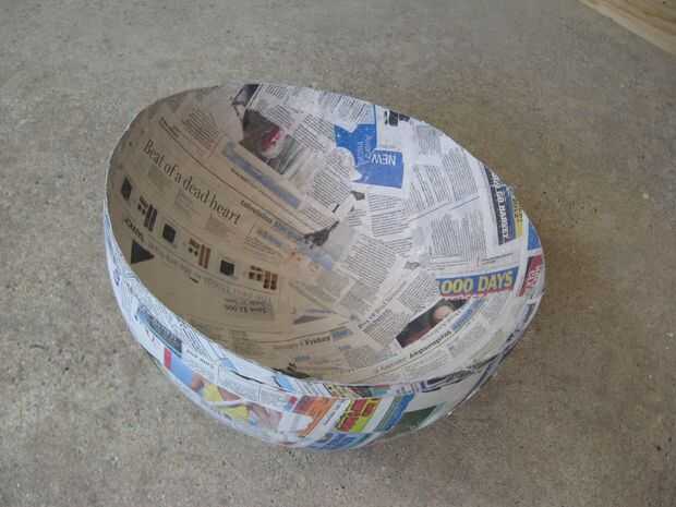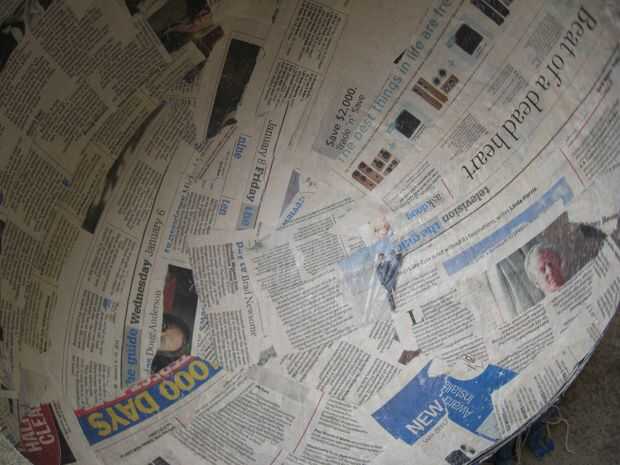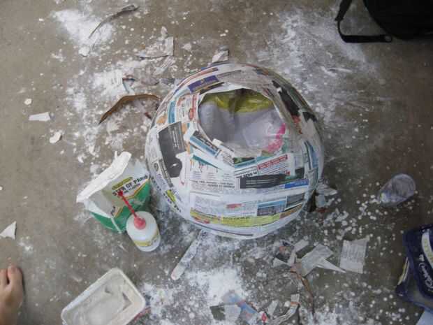 Cubrir la bola con una capa de envoltorio alegre en caso de que el papel maché se pega a la bola. Aplicar las tiras a la bola, hacer tantas capas como necesites para hasta que es bastante difícil. Creo que tenía ~ 6 capas en cada bola.