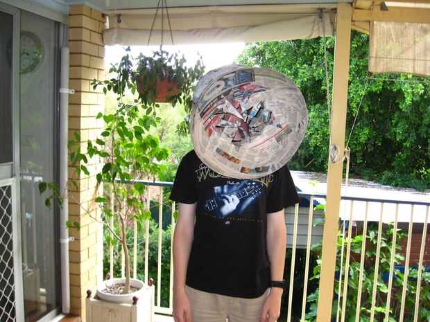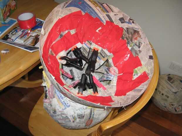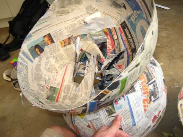 Para colocar la nariz y la cabeza, cortar cuñas de 16 o así que irradian desde el centro de una mitad de la nariz y al lado de la cabeza. Luego les pongo juntos que empareja (áspero) triángulo a triángulo y plegándolas alternativamente en cada mitad. Realmente ayudó a que mi triángulos no eran aún, ya que esto proporciona más fricción y pude usar sin ninguna cinta. PEG/abrazadera del wedgesdown y pegarlas con cinta adhesiva muy. Es probable que la cinta no pegarse al papel maché pero darle un tiro.