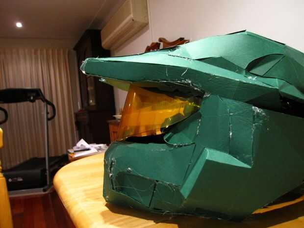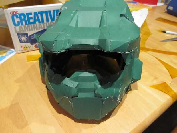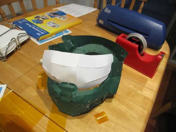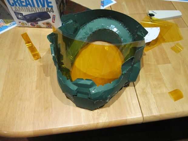 Para hacer la visera que imprimí el visor pepakura real sobre papel para obtener una aproximación del tamaño. Corté el celofán en tres pedazos para que encajaría en la hoja del laminador y laminado de juntos. Usando la hoja de pepakura y el agujero en el casco, cortar el plástico de aproximadamente la forma derecha y pegué en.