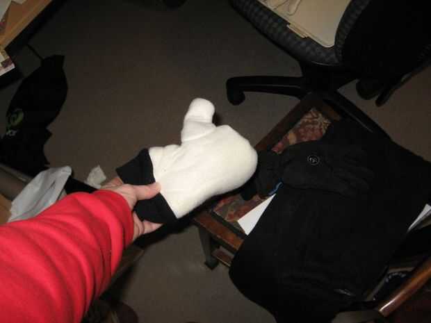 Si ya tienes guantes negros delgadas no dude en usarlos, pero todo lo que tuvimos fueron unos guantes de esquí. Puesto que eran también muy rígido y muy caliente, sacó el relleno, dejando sólo el guante externo. I el revés les, aún algunas costuras y luego solo había Ripeado todo.