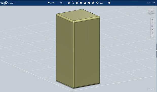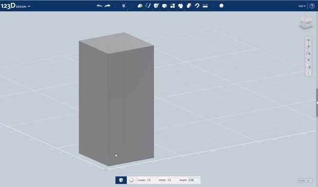 1. Añada un cuboen el menú de primitivas y las dimensiones: 1.5 de largo, 1.5 de ancho, altura 3,25.