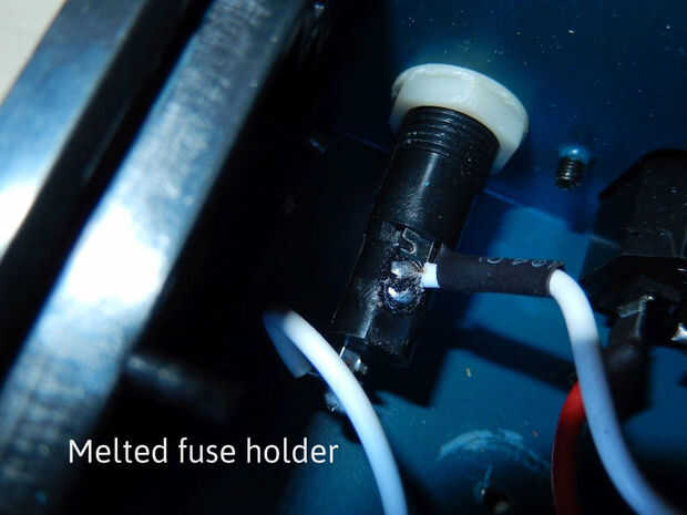 - Uno de los terminales de soldadura en el portafusible se derritió en el soporte (demasiado calor al soldar en la fábrica que supongo).