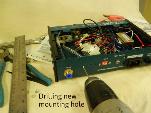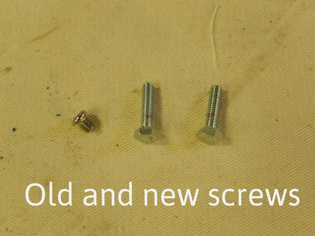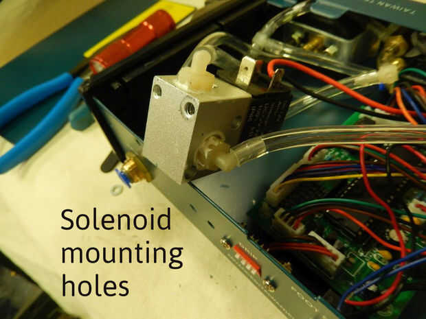 Guardarán el solenoide en su lugar, pero marcado hacia fuera de donde debería ser el segundo agujero. Entonces esta perforado para permitir el montaje correcto. Los tornillos son M4. Tuve algunas en bin mis partes pero estaban demasiado largo. Fue fácil de cortar con una sierra para metales y lime los filos apagado. Entonces les atornillan en su lugar. Para cualquier tornillo que asegúrese de que utiliza arandelas de presión o utiliza algún armario de hilo LockTite para asegurarse de que no vienen sueltas con vibración.