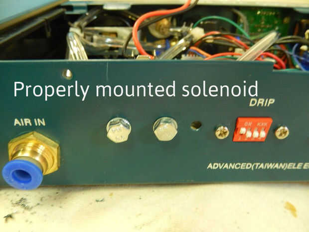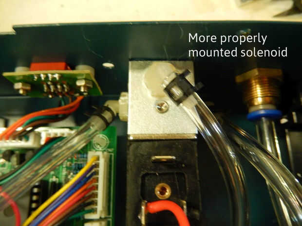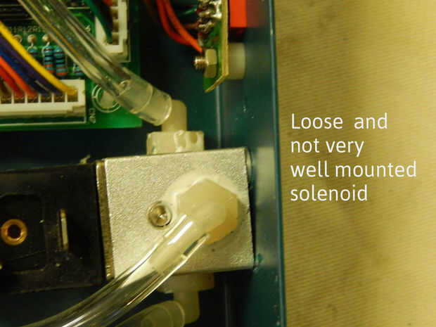 Ahora que el cableado de CA es bueno, usted debe comprobar el solenoide. En la mía me di cuenta que fue sostenido en lugar por un tornillo único (y suelto) que parecía que había sido recogido de la basura. Una vez que quité el tornillo que vi que el solenoide en realidad tenía dos agujeros de montaje. Parecía el caso realmente tenía dos agujeros también pero donde se encontraba el segundo de ellos interferiría con la ubicación de PCB.