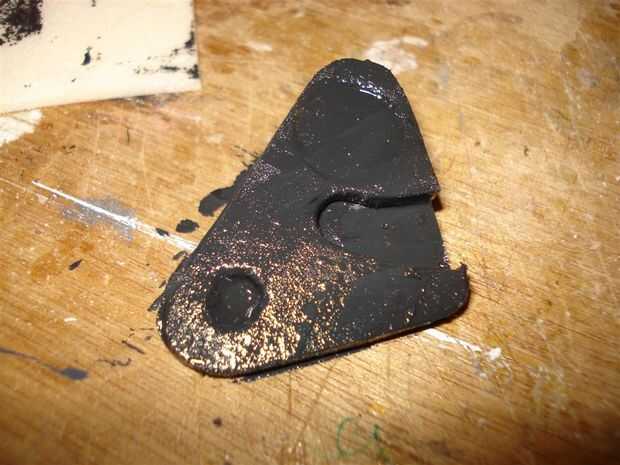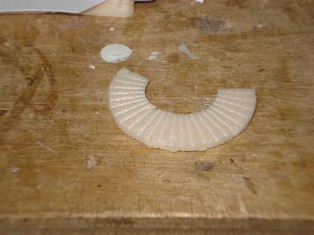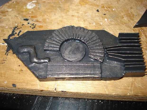 El disipador de calor para el panel lateral se realizó de manera similar, esta vez 5 de las aletas se hizo más largo que los otros y en ángulo en el punto hacia el centro del círculo. El disipador de calor semicircular fue hecho de espuma rosa, las impresiones fueron hechas con el borde de unos alicates, borde puntos de cresta hacia el centro otra vez. El cuadro y el círculo se hacen con espuma de funky, esto permite una impresión en la espuma que se muestra después de la pintura. En retrospectiva el círculo debe tener una impresión interna. El detalle de la tubería se hizo mediante la aplicación de algún pegamento caliente directamente a la placa de soporte, lo que da un sólido medio redondeado buscar al elemento. La placa entera fue pintada con un color oscuro y la pintura del metal de arma se utilizó para secar el cepillo en la parte superior, dándole un aspecto metálico.