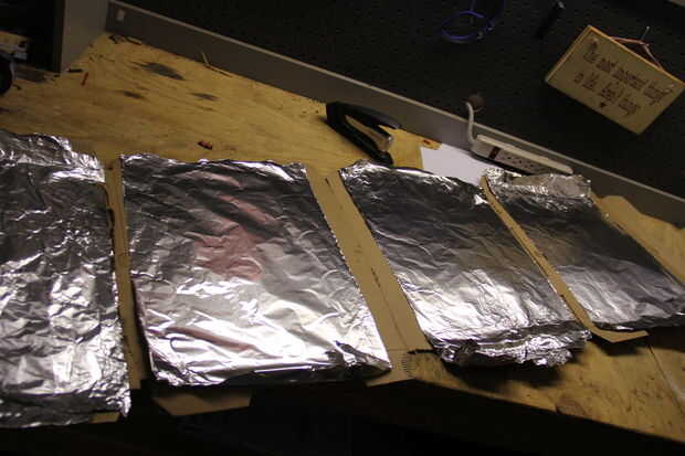 Coloque las tapas de extremo a extremo. Engrape los juntos. Asegúrese de que son capaces de doblar las articulaciones. Rellene los huecos con papel de aluminio si quieres. Esto ayudará a la reflexión. Ahora doblar las tapas en una caja y el extremo de la grapa juntos.