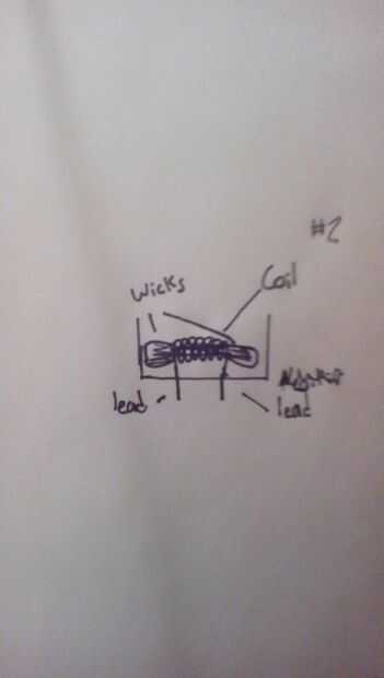 Ahora para el goteador, mecha la bobina y los extremos de la bobina de alimentación a través de los orificios en la parte inferior de madera gotero. A continuación doblar alejados uno del otro y conectar el cable positivo a un cable y el cable negativo al otro cable (imagen de referencia #2) para ver mi producto finshed ver imagen 3