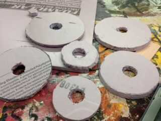 Tomar tres diferentes tamaño de objetos circulares. Trace 2 círculos para cada objeto en la espuma de poliestireno. Recortar los círculos con el cuchillo exacto. Cortar un círculo desde el centro de cada círculo trazando el tubo en el centro.