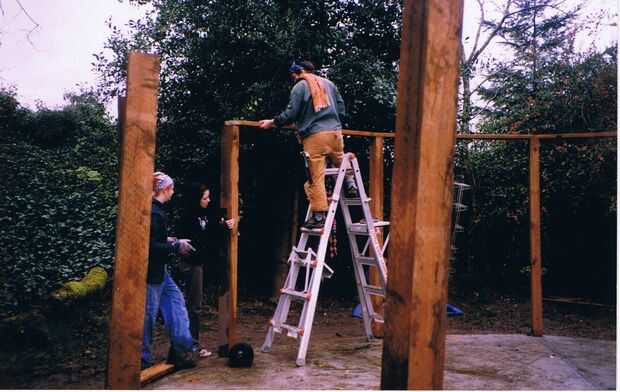 Puede utilizar los soportes post poner los postes para arriba. Utilizamos los soportes en el gran edificio, pero hemos hundido el post directamente en el concreto en el edificio pequeño. Planeo seguir con los soportes para mi próximo edificio botella.