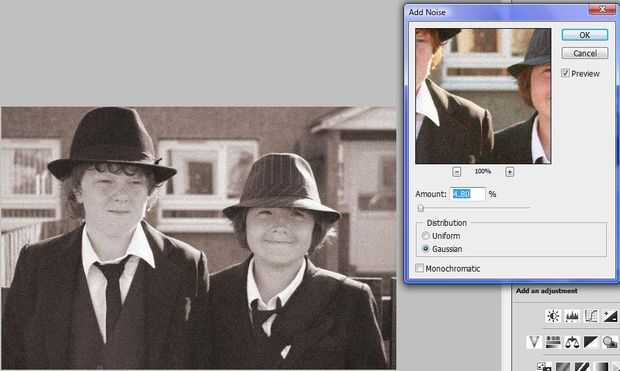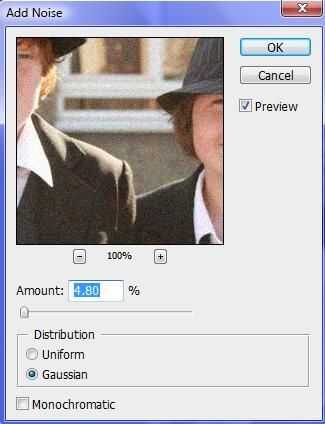 Haga clic en su capa original e ir a filtro > ruido > Añadir ruido y el ruido en unos 4.80% gaussiano a jugar con eso un poco hasta encontrar una buena cantidad de ruido para adaptarse a su imagen y presione el botón OK
