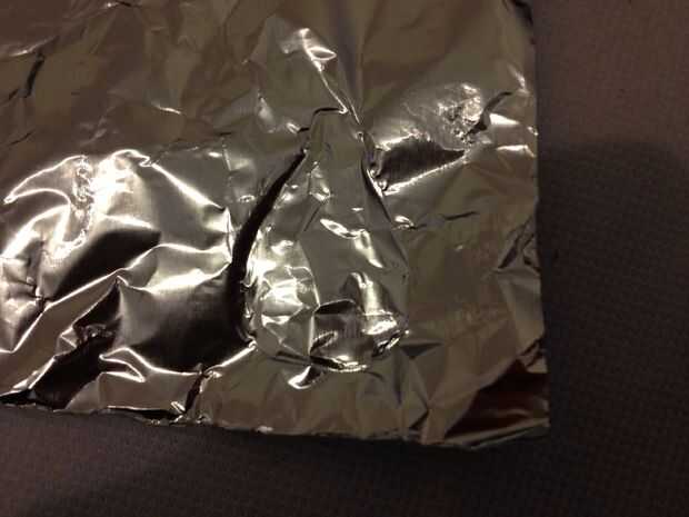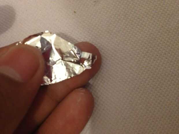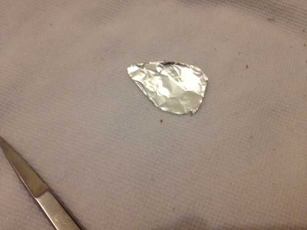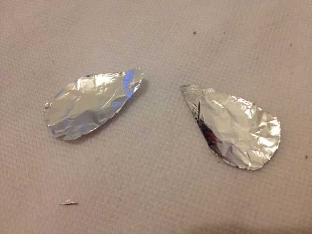 ahora toma el pedazo de papel de aluminio y dibuja un pequeño deja estructura con grasa como un extremo inferior de la moneda y en el extremo superior que sea thinner.now dos de these.make corta un agujero en la parte superior de ambas láminas.