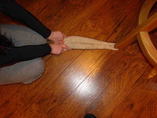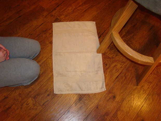 A partir de ahí se agarra cada esquina (a la vez) y empieza a rodar hacia adentro hacia el centro de la toalla hasta que usted posiblemente no puede rodar ya! :-)