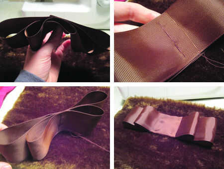 Coser por el medio y envolver un trozo corto de cinta alrededor de la mitad y garantizar en la espalda con unas puntadas, luego coser la proa a la piel del faux.