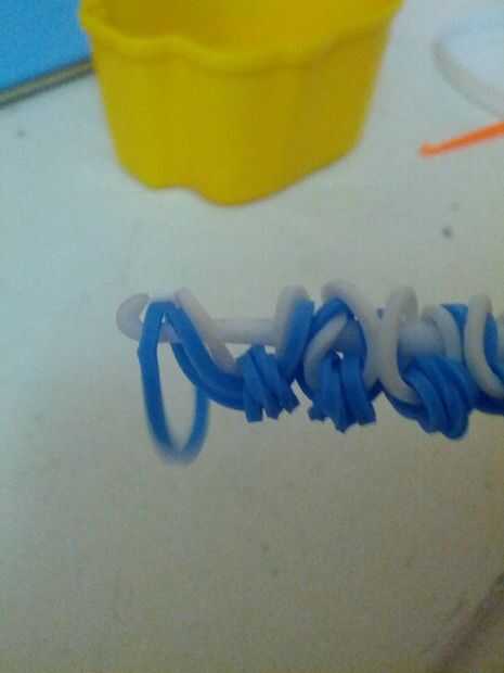 necesita: bandas de un telar del arco iris, un gancho y blanco y negro.Paso 1: Colocación de las bandas Lugar sus bandas en un principio como el triple solo paren en la clavija 4 y mover la banda hacia la derecha y luego haces una línea recta en el c