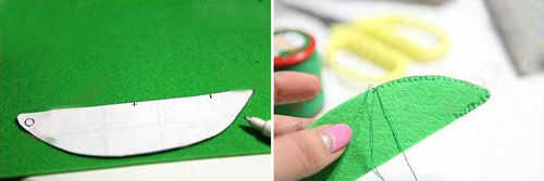 Cortar formas en el papel de la peasecod; cortar los patrones de fieltro según las formas de papel. Coser dos pedazos de peasecods; no olvide dejar espacio de poner dos guisantes.