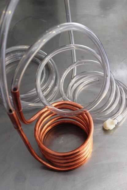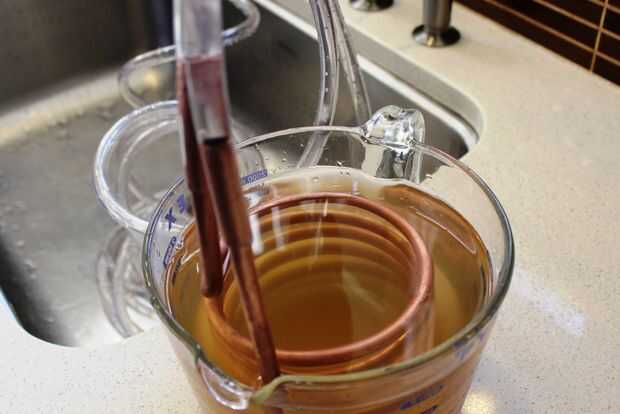 ¿Cómo funciona un refrigerador de inmersión? Básicamente deje correr agua fría del grifo mediante una manguera y a través de una bobina de cobre y luego fuera de la bobina en el otro extremo, mientras que el serpentín está inmerso en el líquido caliente - en este caso, té verde. El cobre es un gran conductor del calor y el calor de la tetera es transferido por el cobre para el agua fría que lo atraviesa. Usted notará que el agua sale de la bobina será más cálido, después de haber robado el calor del líquido está tratando de enfriar.