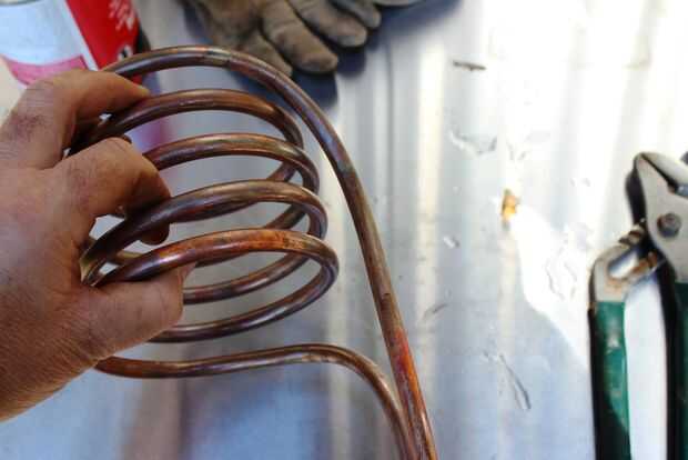 Voila - doblar en una bobina también tiene la ventaja de endurecer el cobre otra vez, así que la bobina acabada es bastante sólida y no necesita más apoyo. Una risa floja final para conseguir las bobinas equidistantes y buscando purdy todos. Ahora está listo para limpiar para arriba y atado a mangueras listo para su uso.