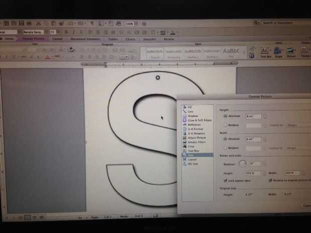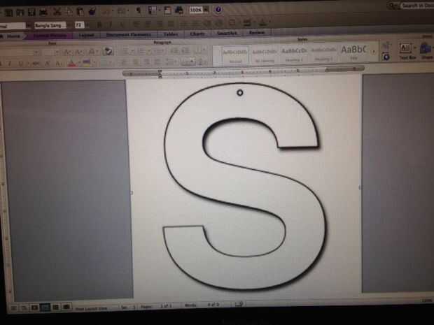 El primer paso para este proyecto es hacer una plantilla de la letra elegida. Cualquiera puede encontrar una fuente que te gusta de una imagen en línea o seleccionando algunas fuentes en Microsoft Word. Personalmente encontré mi letra elegida a través de Google imágenes (http://www.lombard.com.au/cut-out-letter-s-cardboard-ea/w1/i1017400/) insertado en un documento de Word y cambia el tamaño para encajarlo en mi marco de 8 x 10. Puede imprimir la plantilla de la letra o simplemente trazar fuera de la pantalla del ordenador.