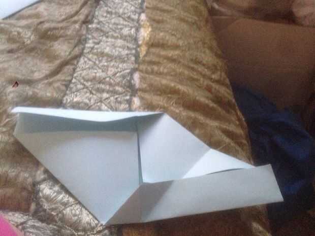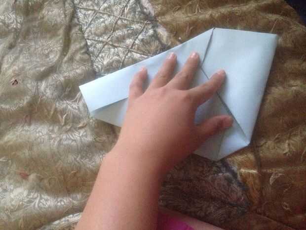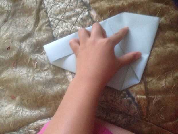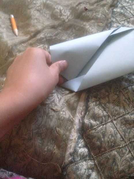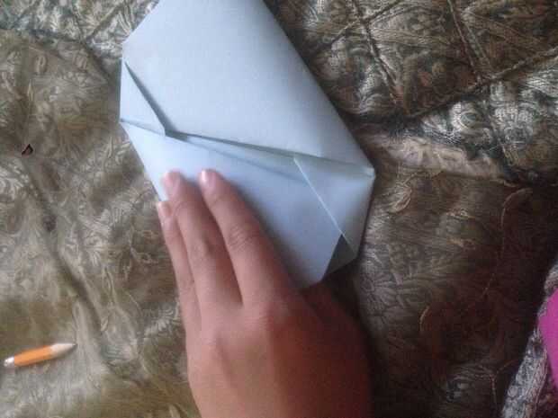 Después de que doble la esquina derecha hasta la mitad y usted verá un pequeño triángulo. Poner la esquina debajo del triángulo. Hacer lo mismo al otro lado.