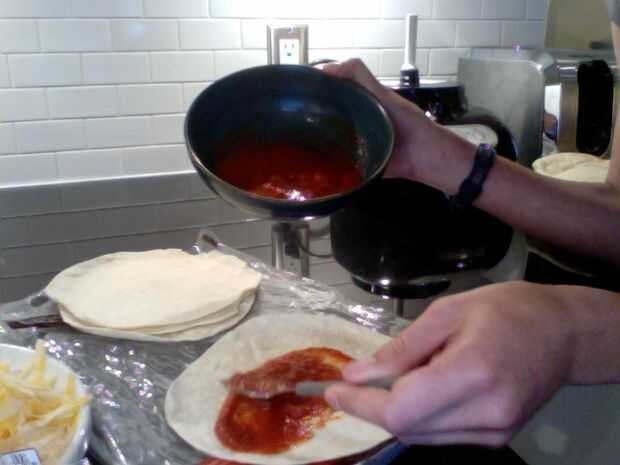 2. Extienda la salsa de tomate uniformemente con una cuchara en la pita.