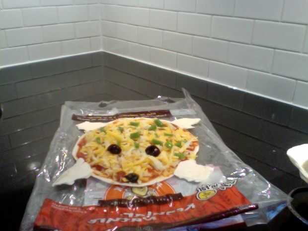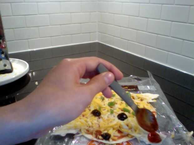 1. rip cuatro tiras incluso de ti el pan de pita extra. 2. colóquelos uniformemente alrededor de la pizza como brazos y piernas. 3. Cubra las piernas con salsa de tomate. 4. Espolvoree las patas con queso, para atar las patas al cuerpo cuando derretido.