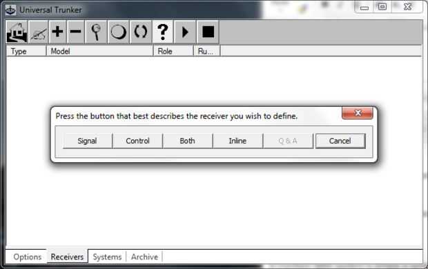 Dos receptores deben configurarse en UniTrunker, un receptor de la 'Señal' utilizado para recibir la señal del canal de control y un receptor de 'Control' utilizado para recibir las transmisiones de canal de voz. Esto puede ser un poco confuso ya que la señal que recibe el receptor 'Señal' es típicamente llamada un 'canal de Control'.