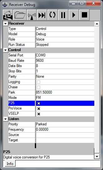 Establecer el modelo de "Debug" y seleccione todos los protocolos de control tres: P25 y ProVoice VSELP.