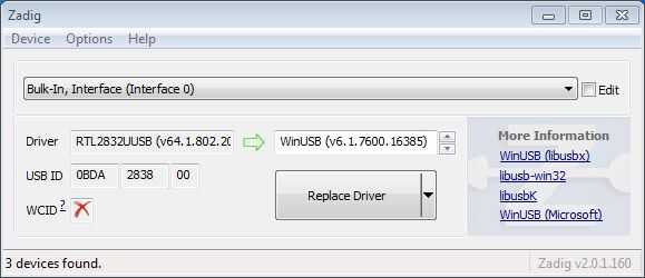 Descargar y descomprimir el Zadig (necesitas un programa como WinRAR o 7-Zip). Tome nota si utiliza Windows XP, necesitará descargar la versión XP. Conectar el receptor a su ordenador e ignorar o cancelar cualquier intento de que Windows intenta hacer para instalar automáticamente los controladores. En Zadig seleccione "Bulk-In Interface (interfaz de 0)". Usted puede necesitar ir en opciones a una lista de todos los dispositivos. Como el controlador para instalar y pulse Instalar/Reemplazar controlador Seleccione la WinUSB.