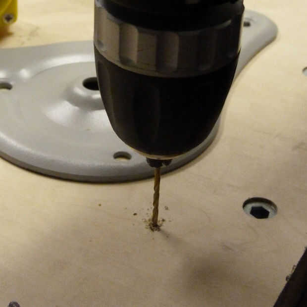 Lugar su 3mm broca en el taladro y cuidadosamente empezar a perforar todos sus orificios, recuerde sólo perforar 2-3mm hacia abajo la tapa de tabla como los orificios piloto están solamente allí para ayudar a sus tornillos placa superior 'bite' en la tapa de tabla.