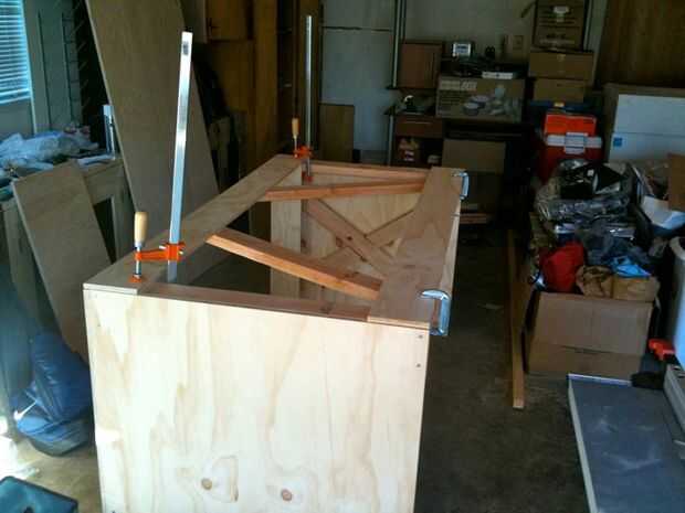 Una vez que tienes tu 2x4s cortar a la longitud correcta, usted querrá obtener sus 70 "x 32" pedazos de. 5" madera contrachapada y se alinean con sus 2x4s. Usted querrá asegurar una tabla a la parte inferior de tus dos por cuatro y uno en la parte superior, como muestra la imagen. Lugar el desplazamiento de 2x4s cuatro pulgadas desde el extremo de la tabla de abajo. Este debe ser el ancho de la pieza lateral (2x4s son 1.5" x3.5"). Es importante el los extremos de sus 2x4s queden al ras con los extremos de la madera contrachapada. Esto garantizará suficiente área de contacto con el escritorio y el piso.