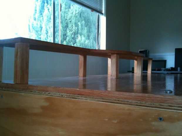 Hacer los cortes 6" tan uniforme como sea posible. Con 8 patas, hay 8 oportunidades tener piernas desiguales. Merece la pena tomarse su tiempo y ser lo más preciso posible. Pegue una pata en cada esquina, tan al ras como sea posible. Pegue las restantes cuatro patas debajo de la media de la plataforma. Realmente decidí poner mis piernas unas pulgadas en desde el inicio de la curva (hacia el centro) para apoyar la plataforma redondeada más. En cualquier caso, hacer la colocación simétrica y tómese su tiempo alinear. Más sujeta las piernas con un tornillo por la parte superior de cada pata. Esto probablemente podría ser saltado si usted está preocupado por la estética de la madera de la plataforma.