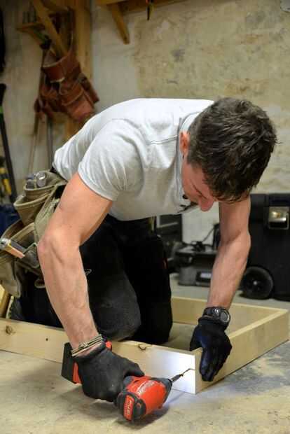 Sobre una superficie plana, montar dos marcos rectangulares. Para crear un escritorio 32 x 60-pulgadas con un voladizo generoso, hicimos nuestros marcos 24 x 54 pulgadas.