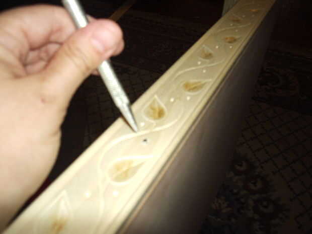 Entonces fui a lo largo de la longitud de la moldura y mi broca más pequeña taladré orificios para las uñas.