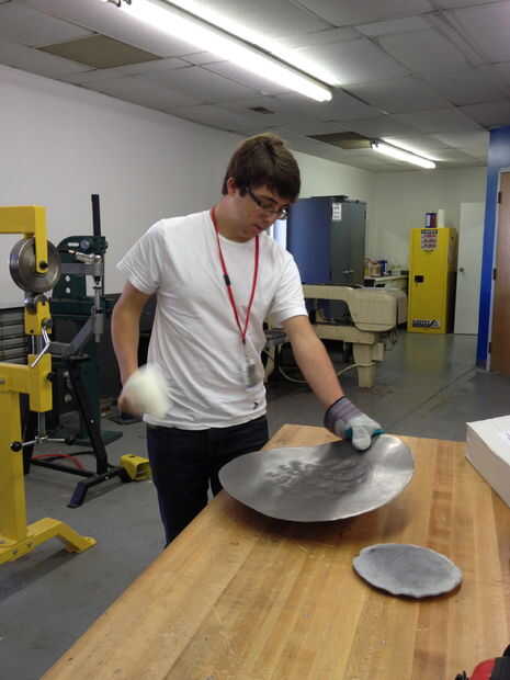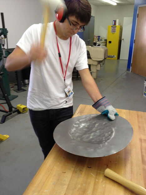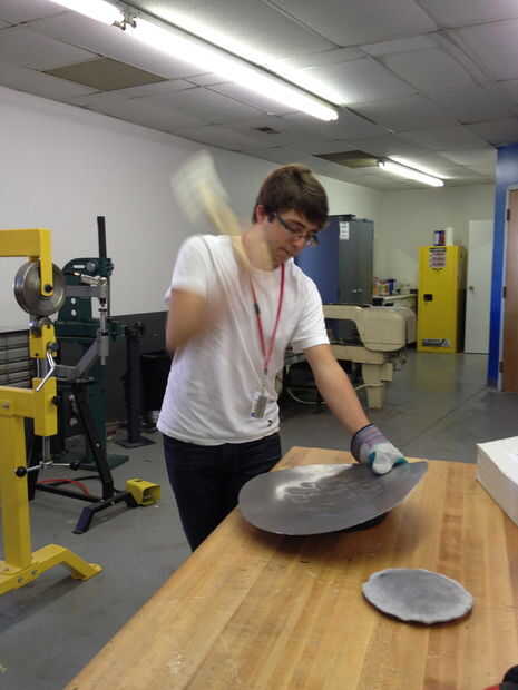 Agarra su saco de arena y un buen mazo fuerte y comenzar a hacer pivotar. Tomando la clase orgánica chapa en techshop aprendí a plato en un recipiente, recomiendo tomar este SBU. Bastante se inicio en el centro luego su forma de trabajo en una fuera de trabajo de espiral una y otra vez a trabajar hacia abajo en un recipiente, luego Dale la vuelta y aplanar el borde exterior con el extremo ancho de la maza. Después es rugosa a flip el macillo al gran final para limpiarlo hasta un poco y suavizar las curvas. Todavía habría un montón de marcas de martillo aunque.