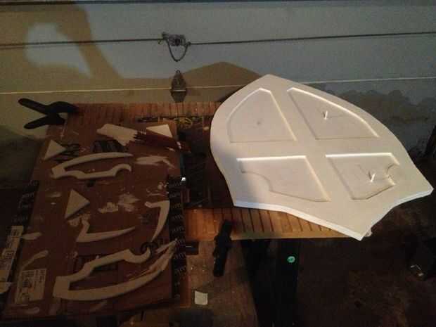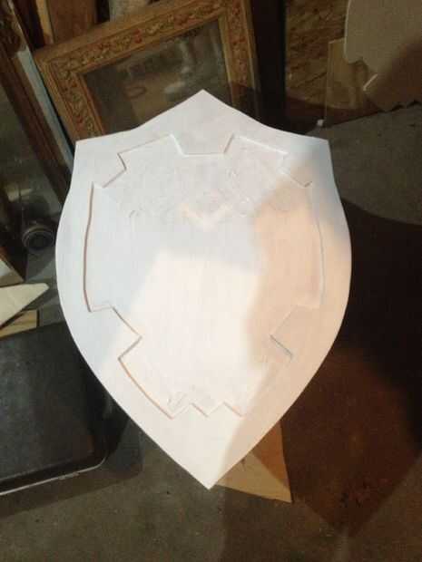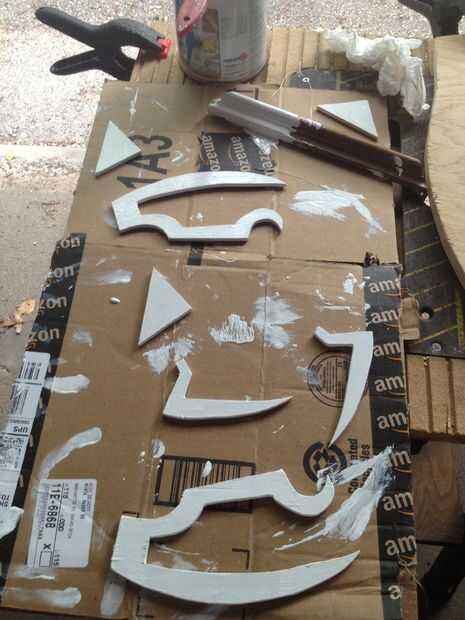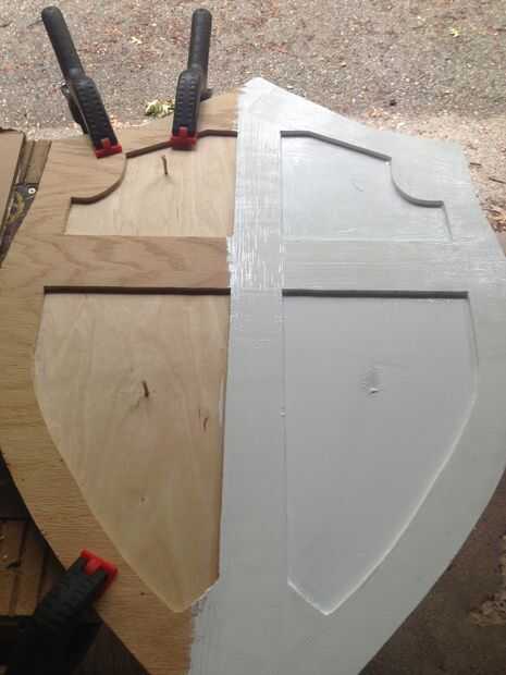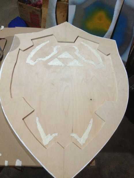 Ahora que están los tornillos y todo es arena, puede comenzar a cebar todo. Si vas con el método de pegamento para las bandas de brazo, poner un trozo pequeño de cinta adhesiva sobre la parte la correa será encolar. Iniciar el cebado de la parte posterior del escudo. Antes de cebar el frente del escudo, quiere poner unas tiras pequeñas de cinta adhesiva sobre las piezas que se pegan. Esto ayudará a fortalecer el vínculo de la Trifuerza y las otras piezas. Dejar éstos en hasta después de haber preparado y pintado el escudo. Cebe el frente cuando se ha secado la parte posterior. Asegúrese de obtener los bordes de todo, dentro y por fuera. Cada pulgada que será pintado debe ser preparado. En cuanto a las piezas pequeñas, quiere cebar el frente y los bordes,